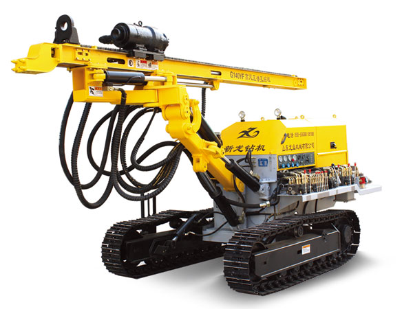 G140YF高风压履带式露天潜孔钻机具有低能耗、高效率、便于运输和野外施工的卓越技术性能,整车动作机构由液压系统实现,只有冲击器消耗风的来源,从而在空压机的选配中大大节省了整套设备的采购成本。回转机构采用了新型马达回转头,使其对露天爆破大孔凿岩作业时能够保持强劲的回转扭矩输出,拖着空压机时,具有机动灵活性,爬坡能力强,适用于崎岖场地作业,穿孔移位方便的特征。该钻机具有穿孔效率高,维修简便、可靠性高,是矿山开采、公路、水利、电站等建设施工的凿岩作业中的理想钻机。